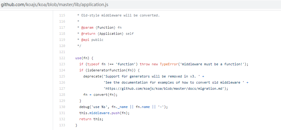 但通过查阅koa源码,app.use只接收一个参数,第二个参数是无效的: