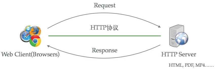 HTTP服务器本质上也是一种应用程序——它通常运行在服务器之上,绑定服务器的IP地址并监听某一个tcp端口来接收并处理HTTP请求,这样客户端(一般来说是IE, Firefox,Chrome这样的浏览器)就能够通过HTTP协议来获取服务器上的网页(HTML格式)、文档(PDF格式)、音频(MP4格式)、视频(MOV格式)等等资源。下图描述的就是这一过程