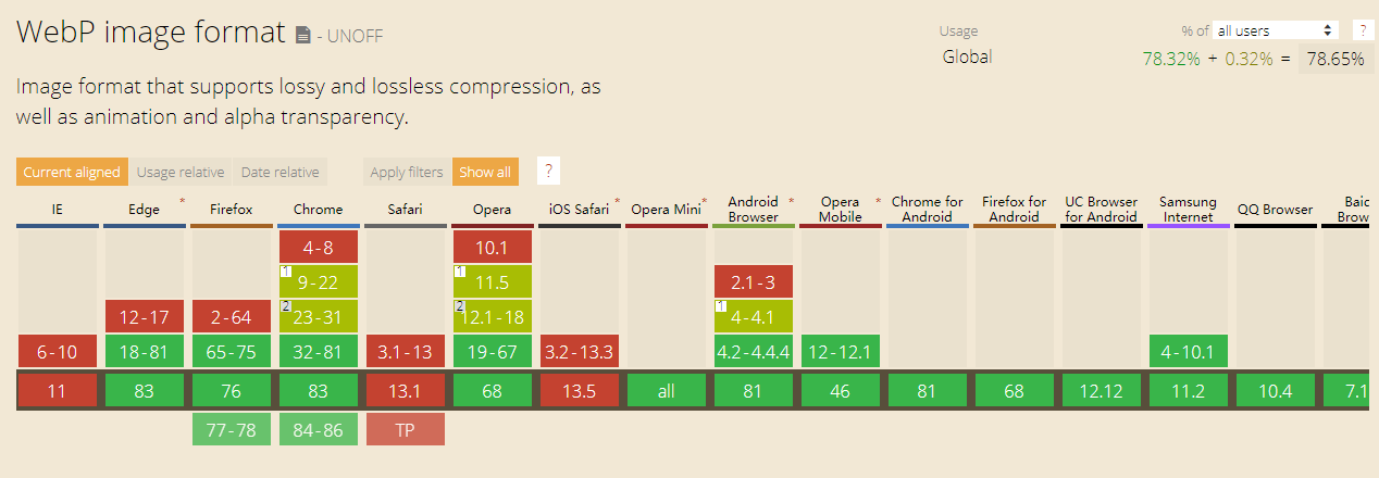 从上图可以看到webp的支持率大约为80%左右,还是存在一些兼容性问题的,对于桌面开发来说,无须关心兼容性,可以放心使用。