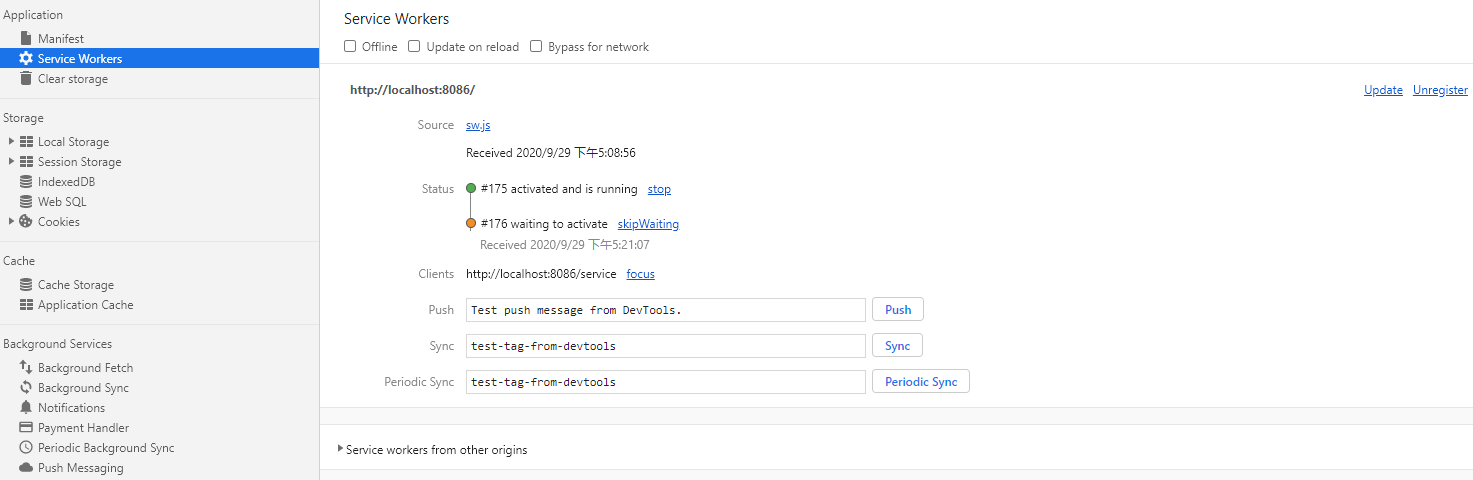 我们再次执行,此处有个小插曲,就是sw.js文件的更新,需要在控制台中手动进行Unregister操作,否则无法更新Service Worker中的代码,在sw.js文件后面加时间戳也只会进入waiting状态: