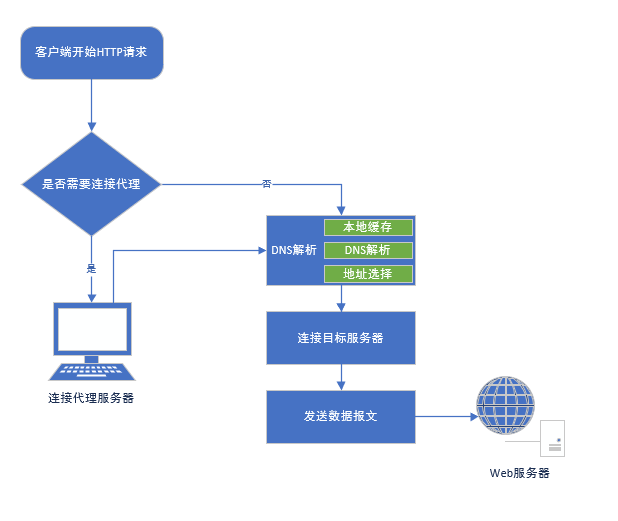启动Fiddler 或 Charles就是启动了一个HTTP代理服务器, 这个时候运行在系统上的http客户端再去发送请求的时候,它就不会再去进行DNS解析,而是直接连接系统告诉他代理所在的地址,这样代理服务器会与客户端建立连接,再然后代理服务器根据请求信息再去连接真正的服务器: