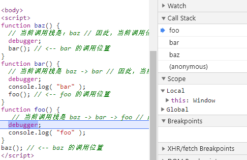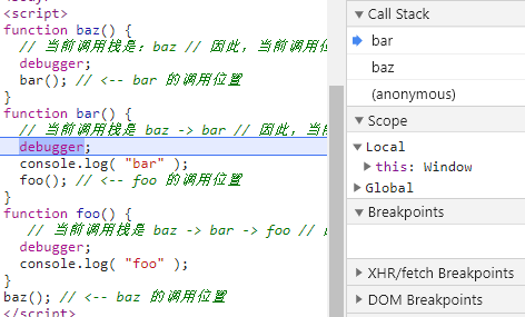// 当前调用栈是 baz -> bar // 因此,当前调用位置在 baz 中