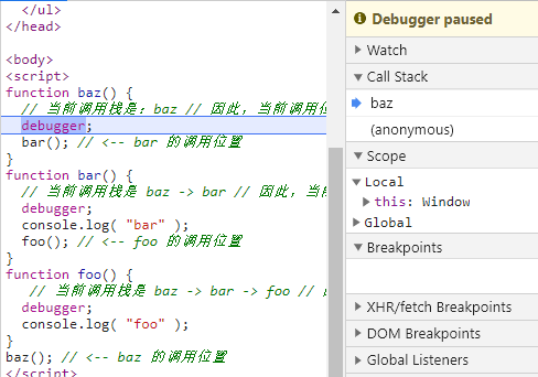 // 当前调用栈是:baz // 因此,当前调用位置是全局作用域