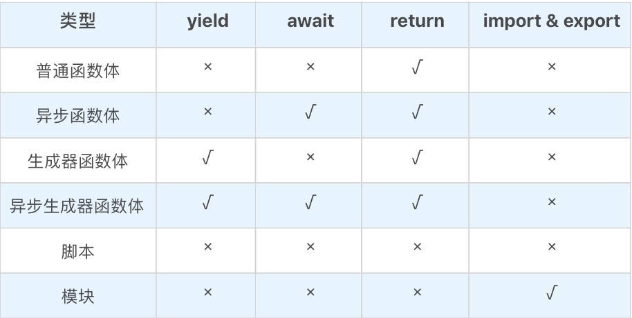 宏任务中可能会执行的代码包括“脚本”、“模块”和“函数体”,函数体其实也是一个语句的列表。跟脚本和模块比起来,函数体中的语句列表中多了 return 语句可以用,函数体实际上有四种,下图做了对比