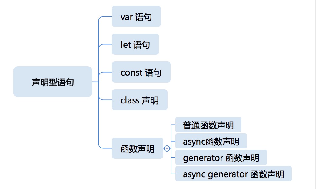 在 JavaScript 标准中,把语句分成了两种:声明和语句。可进行如下分类
